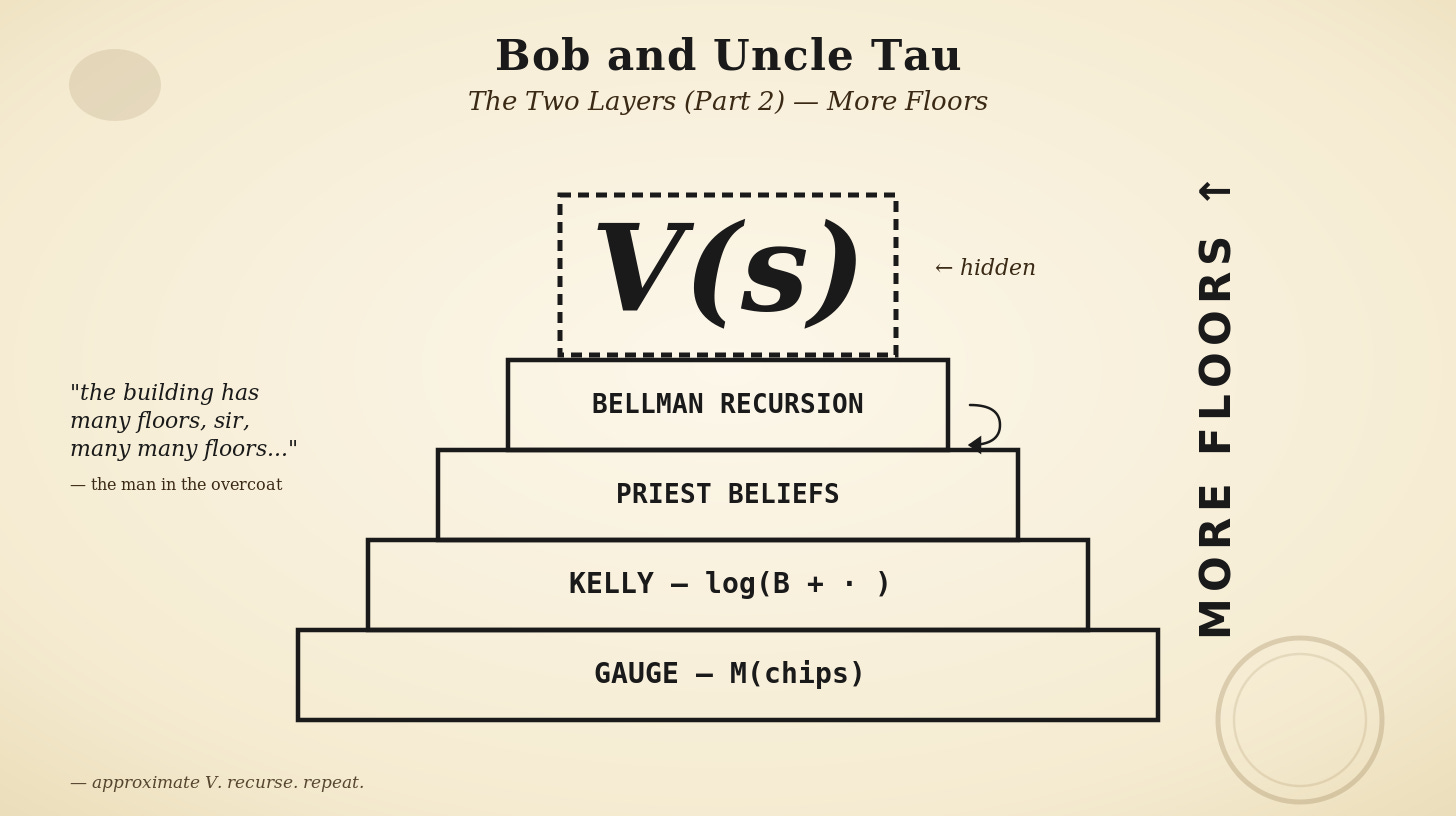 Bob: OK so. Let me stack this up. Gauge at the bottom — ICM or DE, pick a cartoon, the data can’t tell us which is right. Kelly log on top — forced, universal, theorem. Above that, the value function — which depends on priest beliefs about opponents that update slowly, Bellman recursion that has the DPI wall through it, and the joint composition of all four on a finite bankroll. Hidden on multiple axes for multiple independent reasons. But the structure is visible — it’s just the composition — so we build a pipeline that integrates over everything we don’t know and outputs an action.