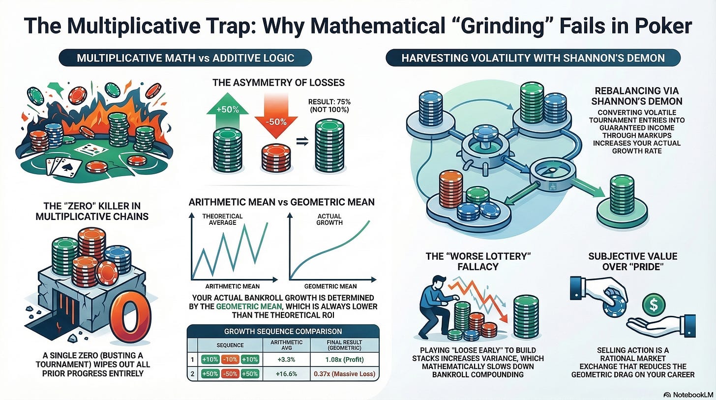 “A single tournament is a chain of multiplicative events. Your stack gets multiplied at each stage: ×1.3 when you win a pot, ×0.7 when you lose one, ×2 when you double up, ×0 when you bust. And that ×0 is the killer. In a multiplicative chain, a single zero wipes out everything that came before it. It doesn’t matter if you ran your stack up ×5 in the first three levels. If stage four is ×0, the product is zero.”